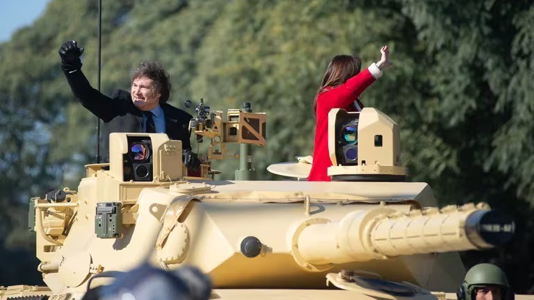 Aquel desfile es recordado también por haber registrado la última imagen de Milei y la vicepresidenta Victoria Villarruel posando juntos y sonrientes, mientras se encontraban subidos a un tanque militar.